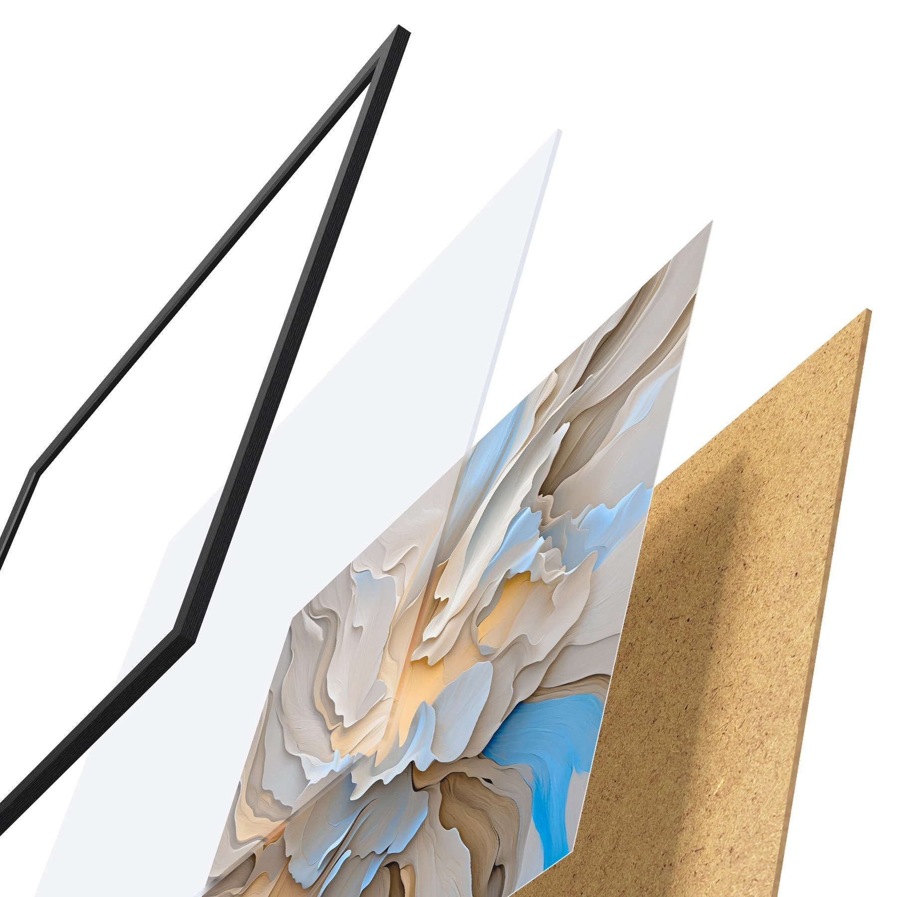 Das Poster besteht aus einem Rahmen, Plexiglas, einem gedruckten Bild und einer Rückwand aus Spanplatten. Dank der Halterungen auf der Rückseite kann das Poster sofort an die Wand gehängt werden.