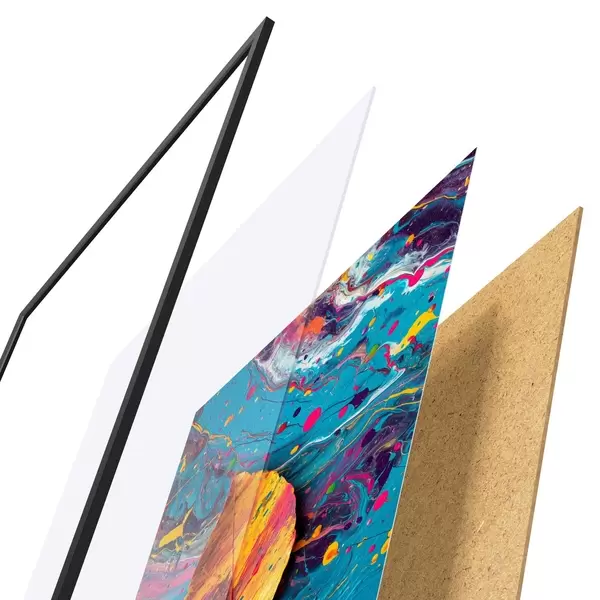 Das Poster besteht aus einem Rahmen, Plexiglas, einem gedruckten Bild und einer Rückwand aus Spanplatten. Dank der Halterungen auf der Rückseite kann das Poster sofort an die Wand gehängt werden.