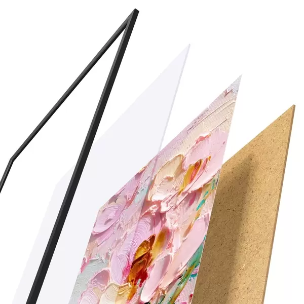 Das Poster besteht aus einem Rahmen, Plexiglas, einem gedruckten Bild und einer Rückwand aus Spanplatten. Dank der Halterungen auf der Rückseite kann das Poster sofort an die Wand gehängt werden.