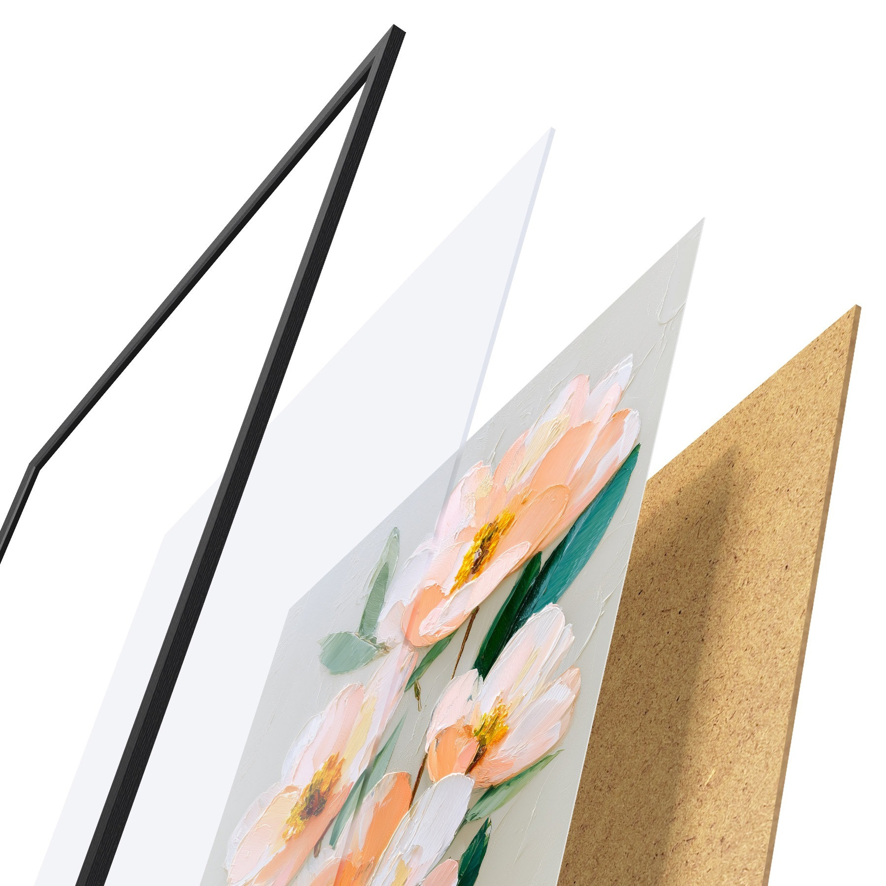 Das Poster besteht aus einem Rahmen, Plexiglas, einem gedruckten Bild und einer Rückwand aus Spanplatten. Dank der Halterungen auf der Rückseite kann das Poster sofort an die Wand gehängt werden.