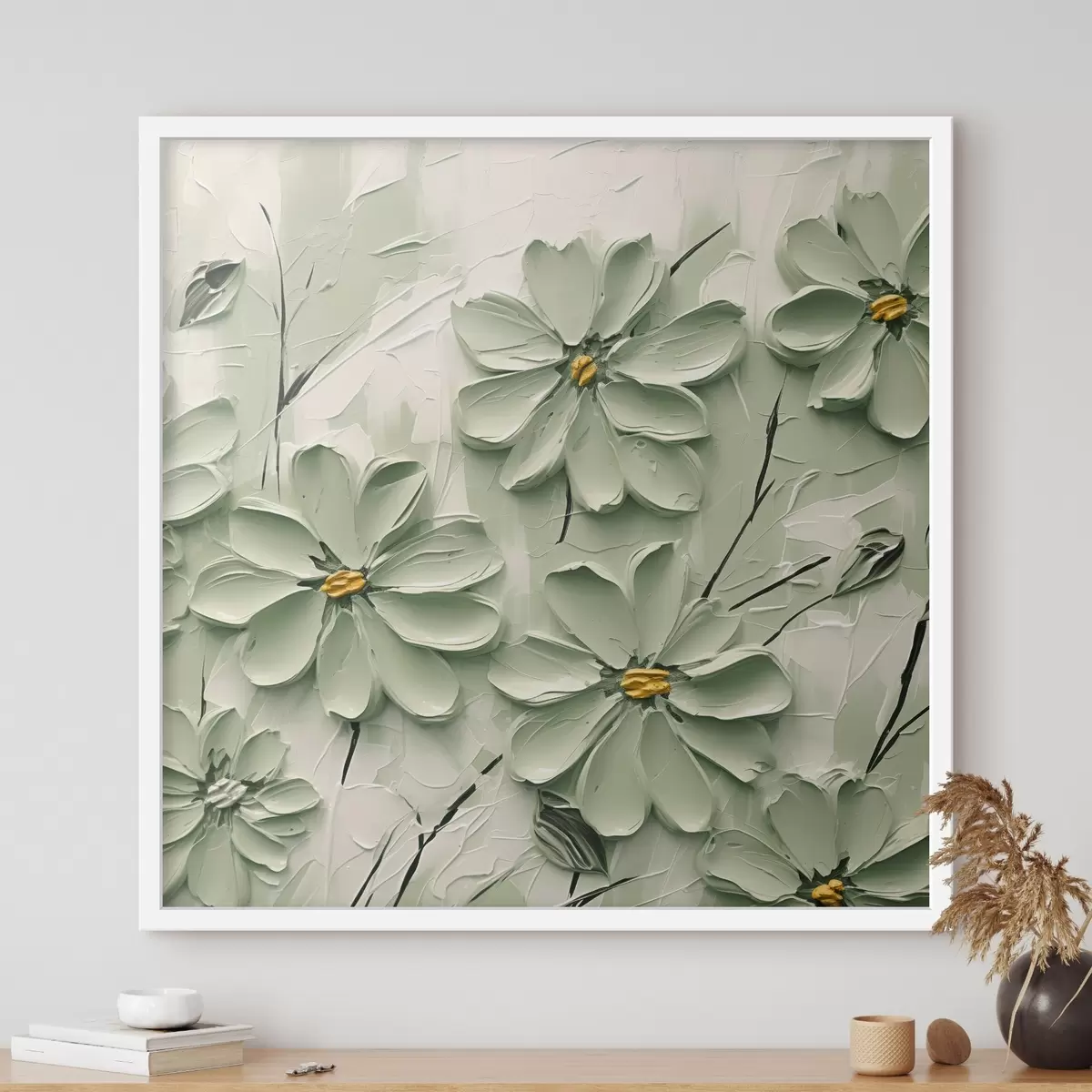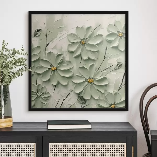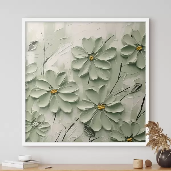 Poster Grüne Blumen mit gelben Zentren gemalt in dicken Pinselstrichen auf einem hellen Hintergrund Nr f45265
