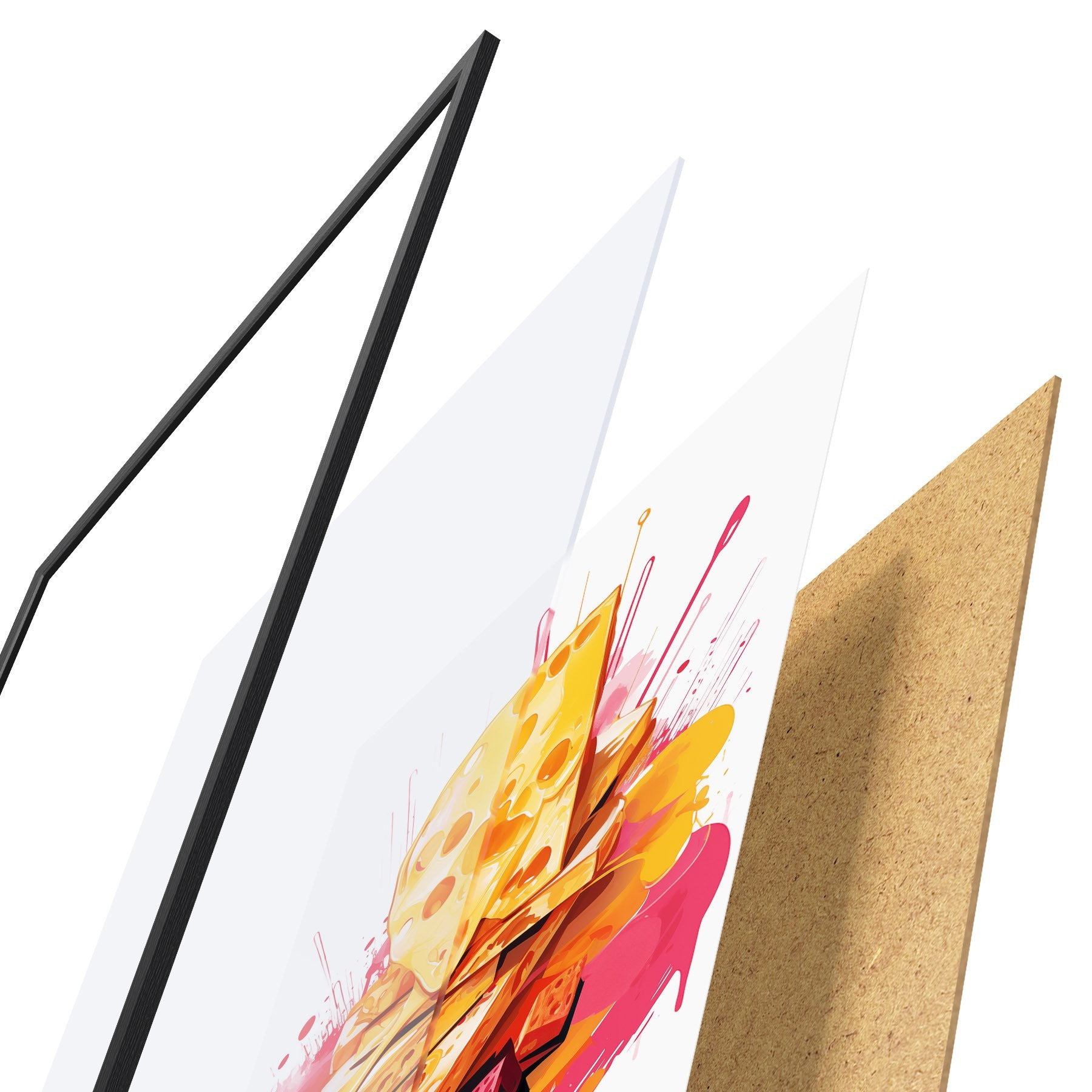 Das Poster besteht aus einem Rahmen, Plexiglas, einem gedruckten Bild und einer Rückwand aus Spanplatten. Dank der Halterungen auf der Rückseite kann das Poster sofort an die Wand gehängt werden.