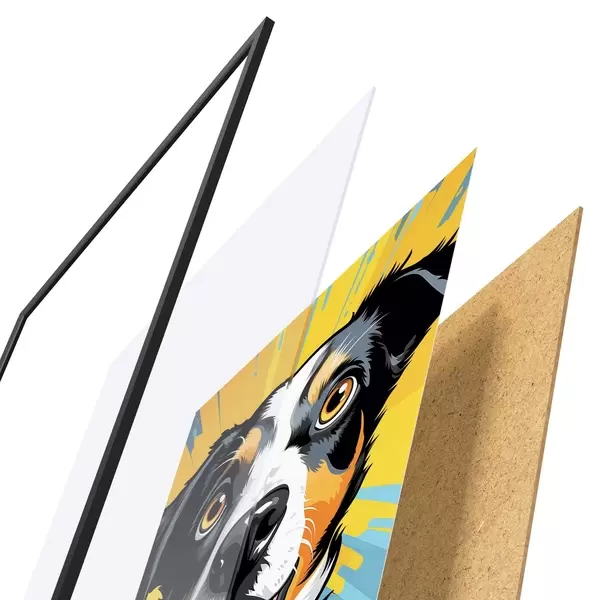 Das Poster besteht aus einem Rahmen, Plexiglas, einem gedruckten Bild und einer Rückwand aus Spanplatten. Dank der Halterungen auf der Rückseite kann das Poster sofort an die Wand gehängt werden.