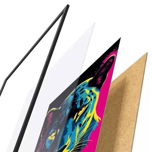 Das Poster besteht aus einem Rahmen, Plexiglas, einem gedruckten Bild und einer Rückwand aus Spanplatten. Dank der Halterungen auf der Rückseite kann das Poster sofort an die Wand gehängt werden.