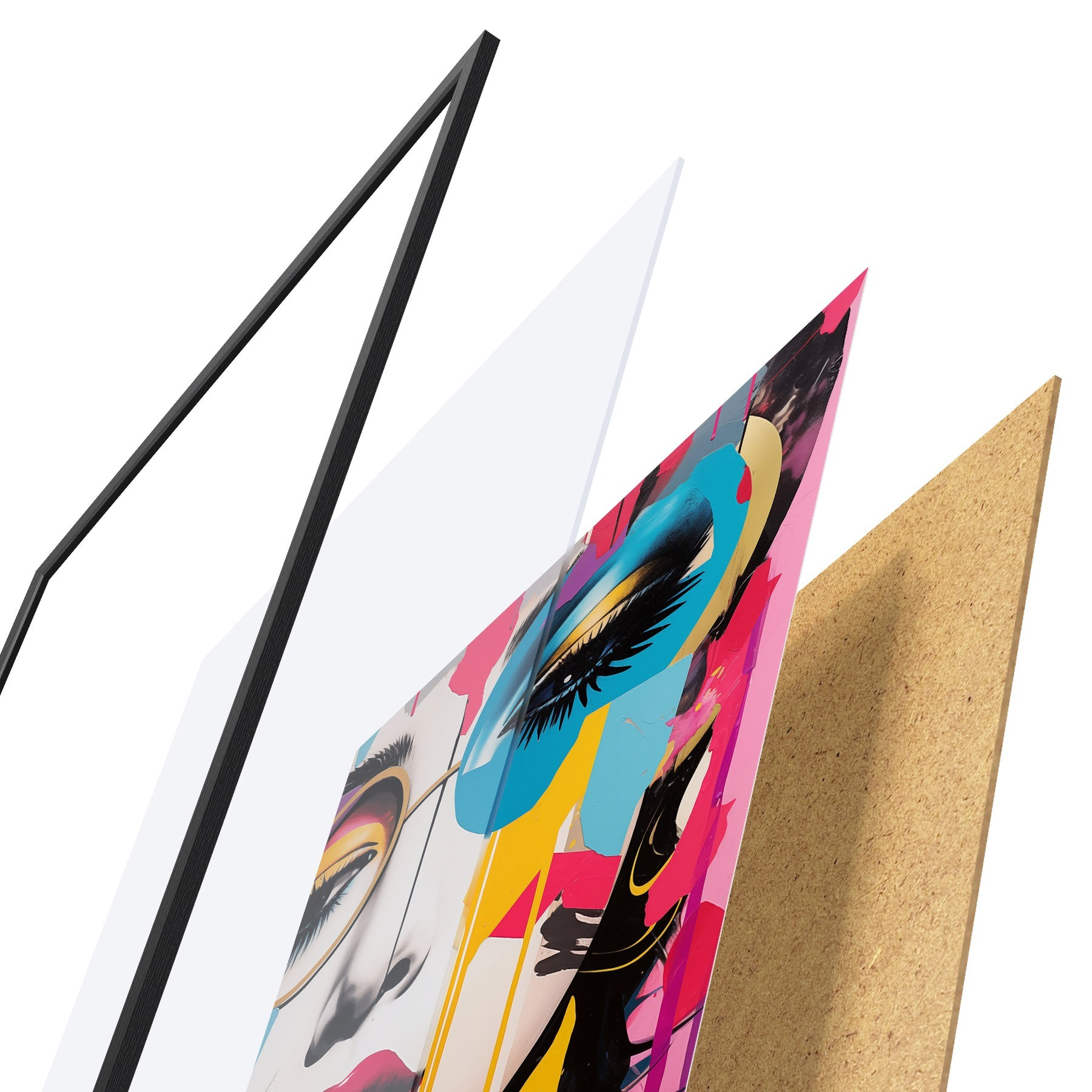 Das Poster besteht aus einem Rahmen, Plexiglas, einem gedruckten Bild und einer Rückwand aus Spanplatten. Dank der Halterungen auf der Rückseite kann das Poster sofort an die Wand gehängt werden.