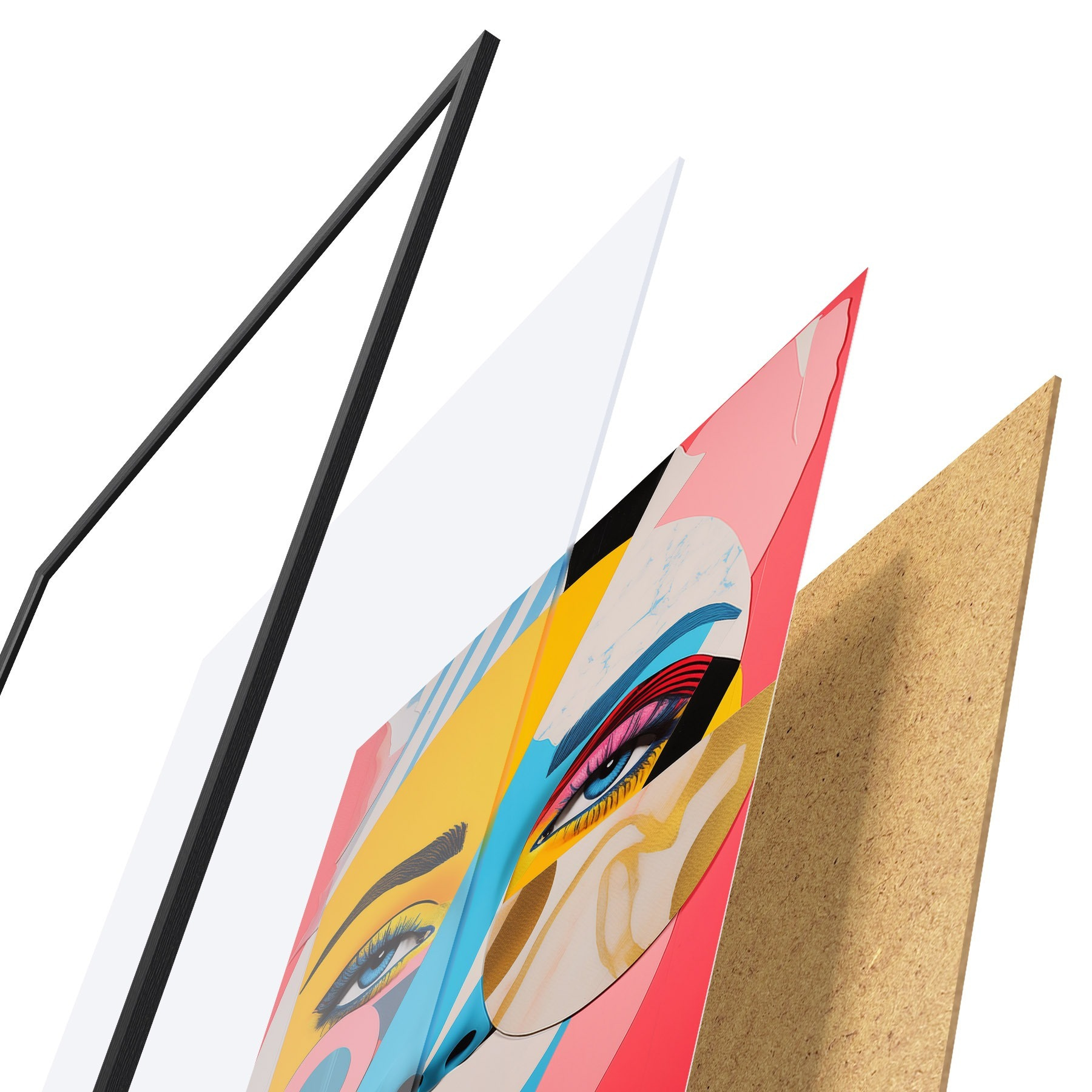 Das Poster besteht aus einem Rahmen, Plexiglas, einem gedruckten Bild und einer Rückwand aus Spanplatten. Dank der Halterungen auf der Rückseite kann das Poster sofort an die Wand gehängt werden.