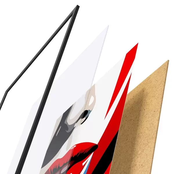 Das Poster besteht aus einem Rahmen, Plexiglas, einem gedruckten Bild und einer Rückwand aus Spanplatten. Dank der Halterungen auf der Rückseite kann das Poster sofort an die Wand gehängt werden.