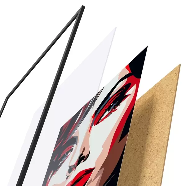 Das Poster besteht aus einem Rahmen, Plexiglas, einem gedruckten Bild und einer Rückwand aus Spanplatten. Dank der Halterungen auf der Rückseite kann das Poster sofort an die Wand gehängt werden.
