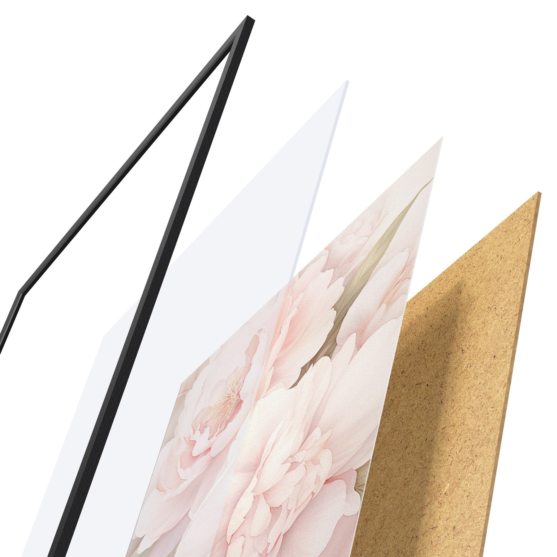 Das Poster besteht aus einem Rahmen, Plexiglas, einem gedruckten Bild und einer Rückwand aus Spanplatten. Dank der Halterungen auf der Rückseite kann das Poster sofort an die Wand gehängt werden.