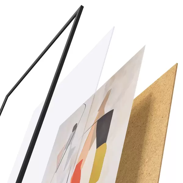 Das Poster besteht aus einem Rahmen, Plexiglas, einem gedruckten Bild und einer Rückwand aus Spanplatten. Dank der Halterungen auf der Rückseite kann das Poster sofort an die Wand gehängt werden.