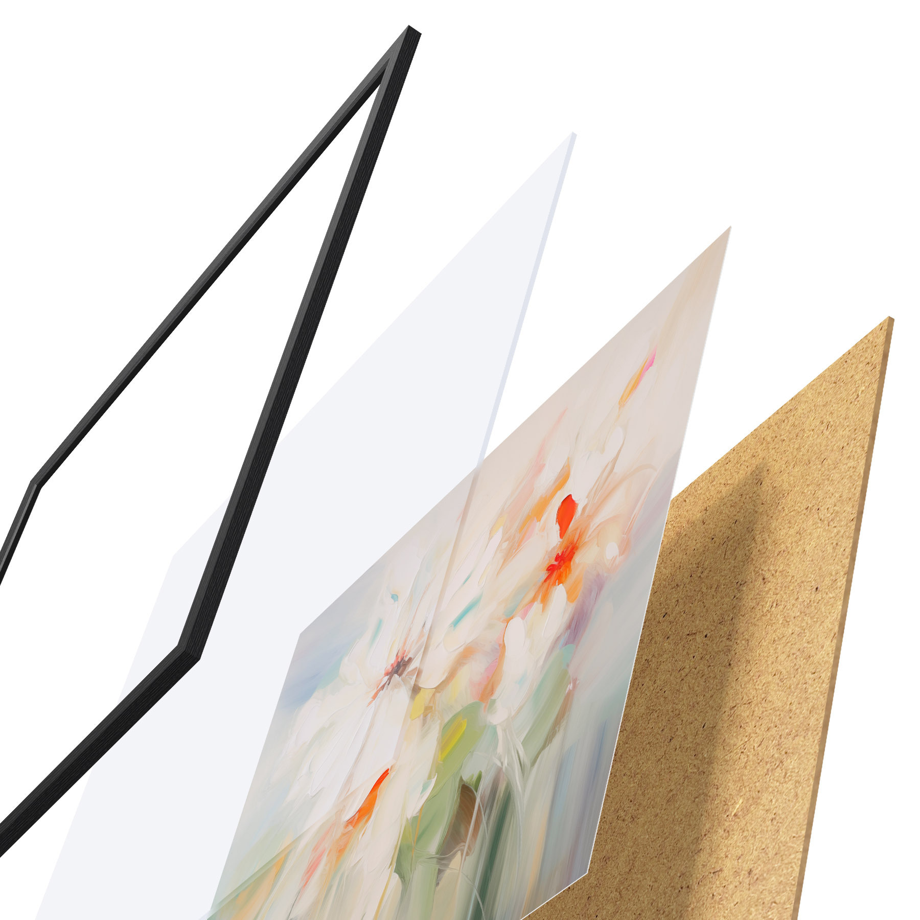 Das Poster besteht aus einem Rahmen, Plexiglas, einem gedruckten Bild und einer Rückwand aus Spanplatten. Dank der Halterungen auf der Rückseite kann das Poster sofort an die Wand gehängt werden.