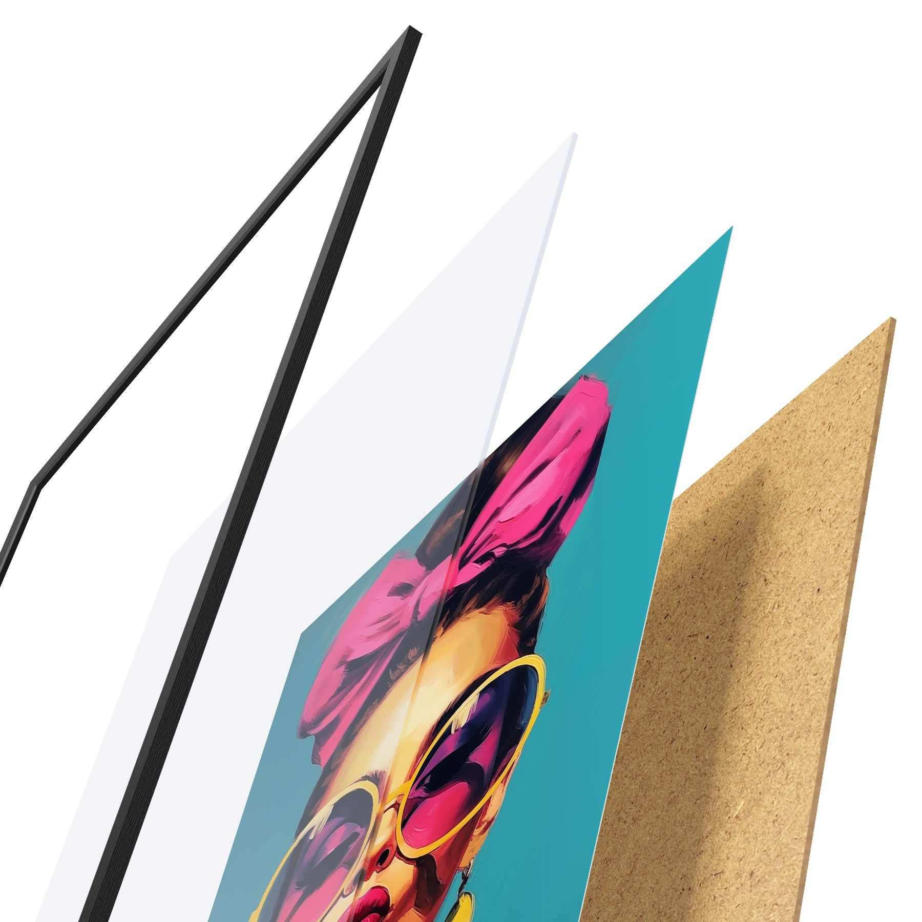 Das Poster besteht aus einem Rahmen, Plexiglas, einem gedruckten Bild und einer Rückwand aus Spanplatten. Dank der Halterungen auf der Rückseite kann das Poster sofort an die Wand gehängt werden.