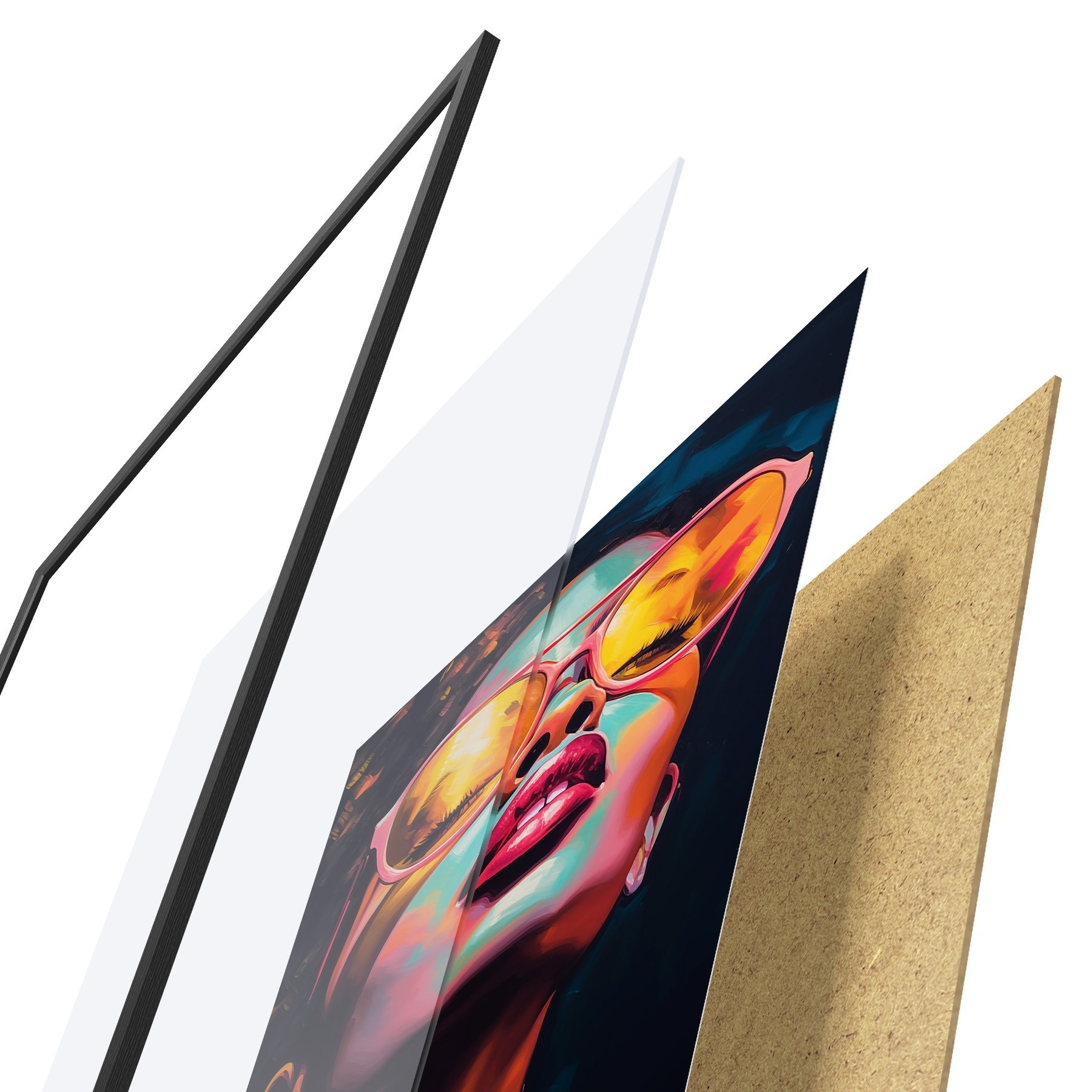 Das Poster besteht aus einem Rahmen, Plexiglas, einem gedruckten Bild und einer Rückwand aus Spanplatten. Dank der Halterungen auf der Rückseite kann das Poster sofort an die Wand gehängt werden.