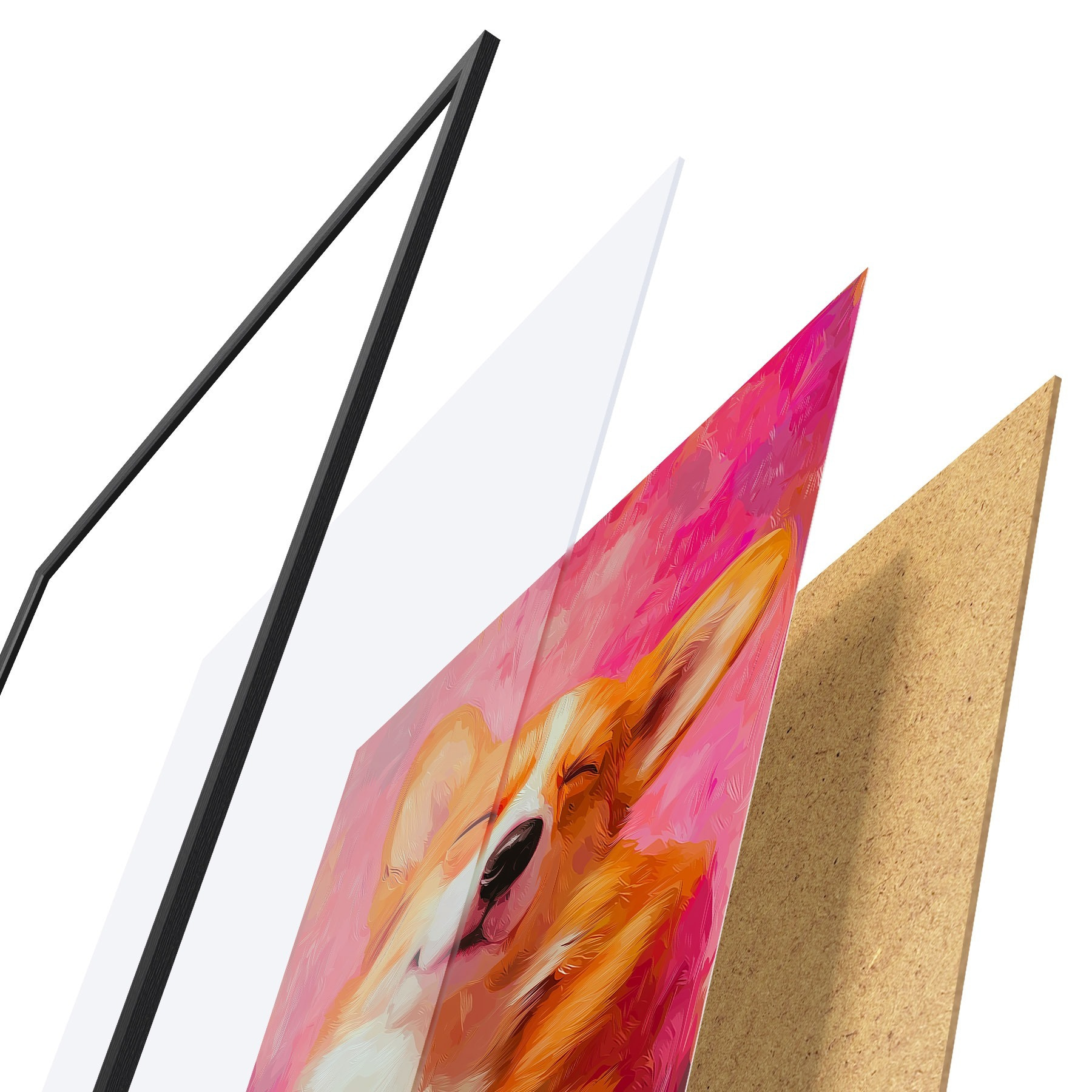 Das Poster besteht aus einem Rahmen, Plexiglas, einem gedruckten Bild und einer Rückwand aus Spanplatten. Dank der Halterungen auf der Rückseite kann das Poster sofort an die Wand gehängt werden.