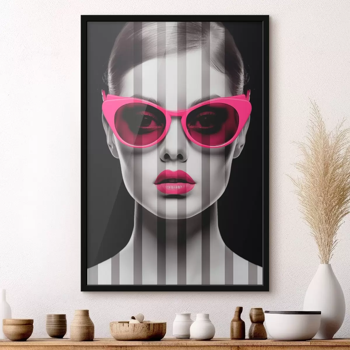 Poster Frau mit rosa Brille mit schwarzen und weißen Streifen f45315