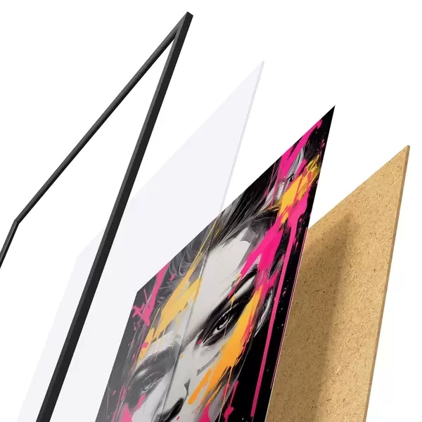 Das Poster besteht aus einem Rahmen, Plexiglas, einem gedruckten Bild und einer Rückwand aus Spanplatten. Dank der Halterungen auf der Rückseite kann das Poster sofort an die Wand gehängt werden.