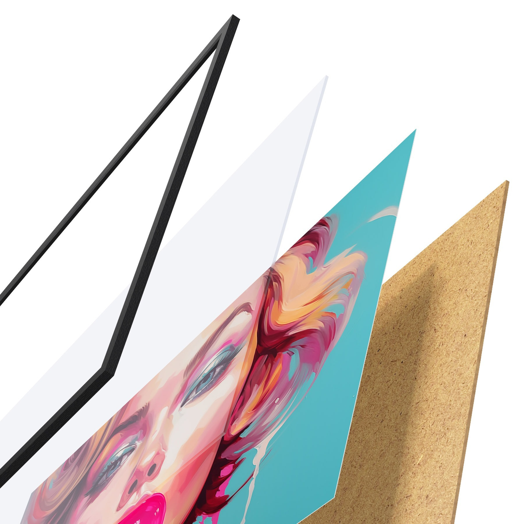 Das Poster besteht aus einem Rahmen, Plexiglas, einem gedruckten Bild und einer Rückwand aus Spanplatten. Dank der Halterungen auf der Rückseite kann das Poster sofort an die Wand gehängt werden.