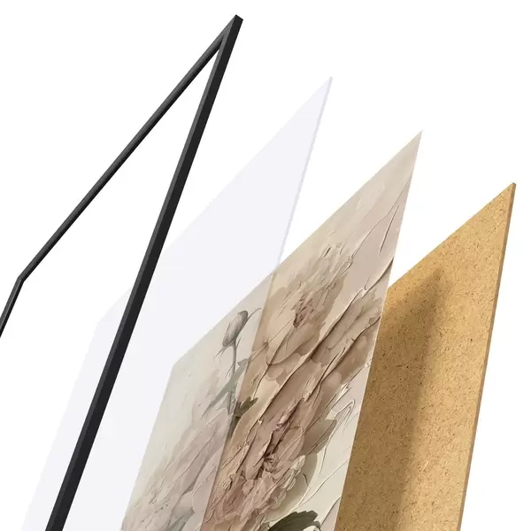 Das Poster besteht aus einem Rahmen, Plexiglas, einem gedruckten Bild und einer Rückwand aus Spanplatten. Dank der Halterungen auf der Rückseite kann das Poster sofort an die Wand gehängt werden.