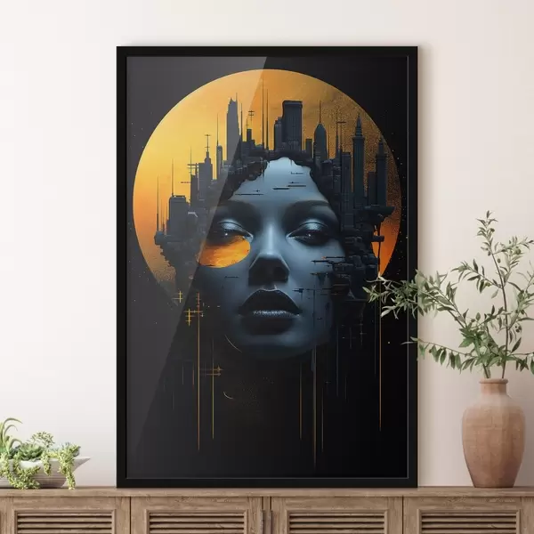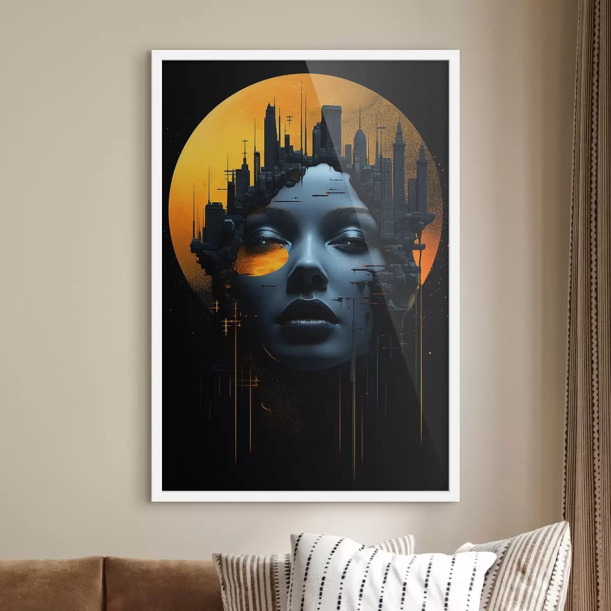 Poster Menschen, Mädchengesicht auf einem Stadthintergrund, abstrakt f45341