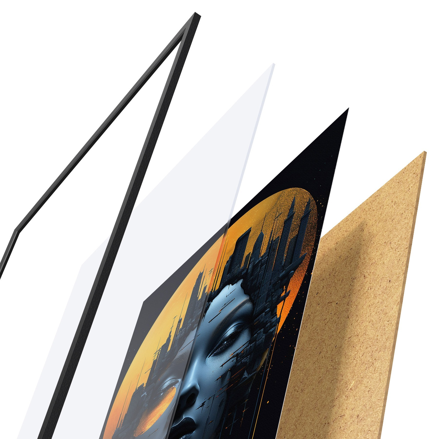Das Poster besteht aus einem Rahmen, Plexiglas, einem gedruckten Bild und einer Rückwand aus Spanplatten. Dank der Halterungen auf der Rückseite kann das Poster sofort an die Wand gehängt werden.