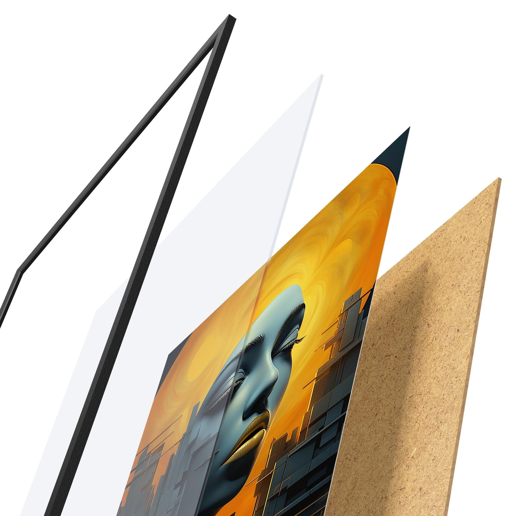 Das Poster besteht aus einem Rahmen, Plexiglas, einem gedruckten Bild und einer Rückwand aus Spanplatten. Dank der Halterungen auf der Rückseite kann das Poster sofort an die Wand gehängt werden.