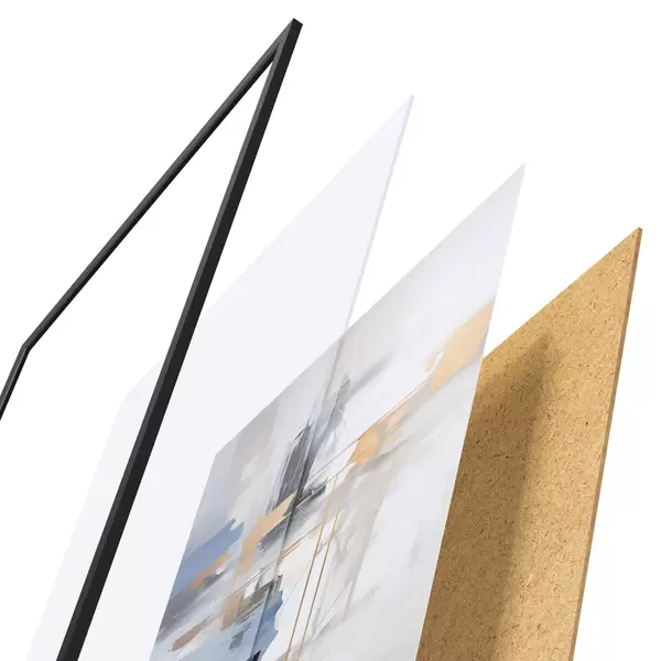 Das Poster besteht aus einem Rahmen, Plexiglas, einem gedruckten Bild und einer Rückwand aus Spanplatten. Dank der Halterungen auf der Rückseite kann das Poster sofort an die Wand gehängt werden.