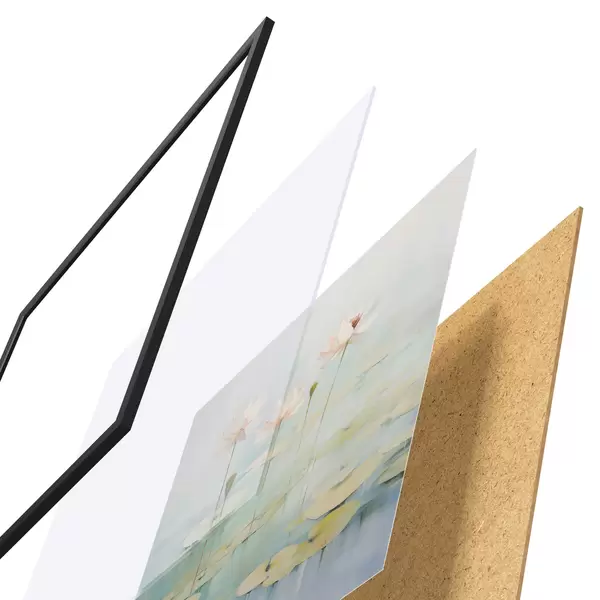 Das Poster besteht aus einem Rahmen, Plexiglas, einem gedruckten Bild und einer Rückwand aus Spanplatten. Dank der Halterungen auf der Rückseite kann das Poster sofort an die Wand gehängt werden.