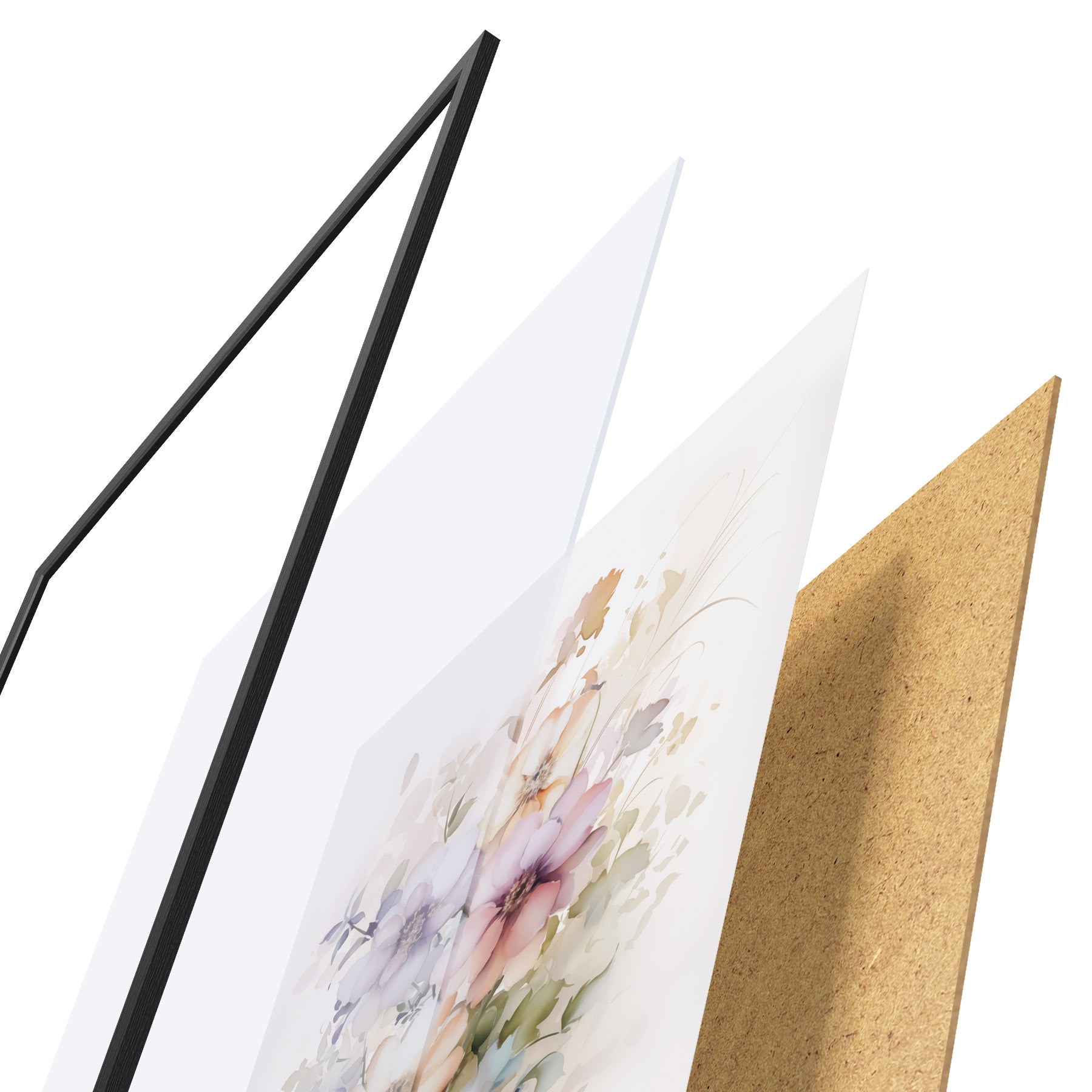 Das Poster besteht aus einem Rahmen, Plexiglas, einem gedruckten Bild und einer Rückwand aus Spanplatten. Dank der Halterungen auf der Rückseite kann das Poster sofort an die Wand gehängt werden.