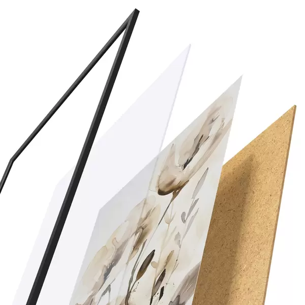 Das Poster besteht aus einem Rahmen, Plexiglas, einem gedruckten Bild und einer Rückwand aus Spanplatten. Dank der Halterungen auf der Rückseite kann das Poster sofort an die Wand gehängt werden.
