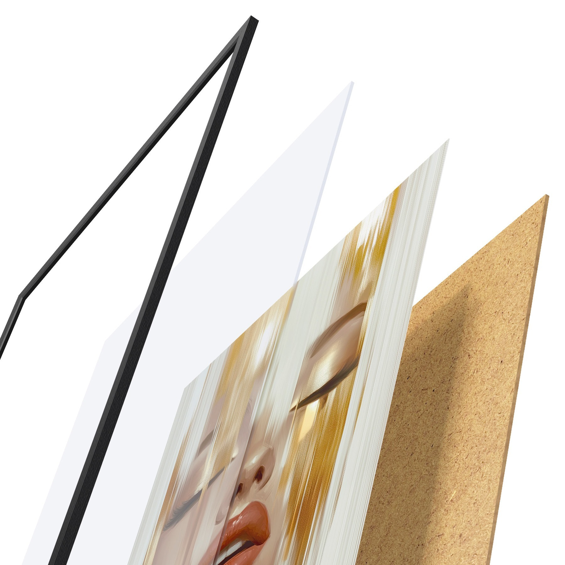 Das Poster besteht aus einem Rahmen, Plexiglas, einem gedruckten Bild und einer Rückwand aus Spanplatten. Dank der Halterungen auf der Rückseite kann das Poster sofort an die Wand gehängt werden.