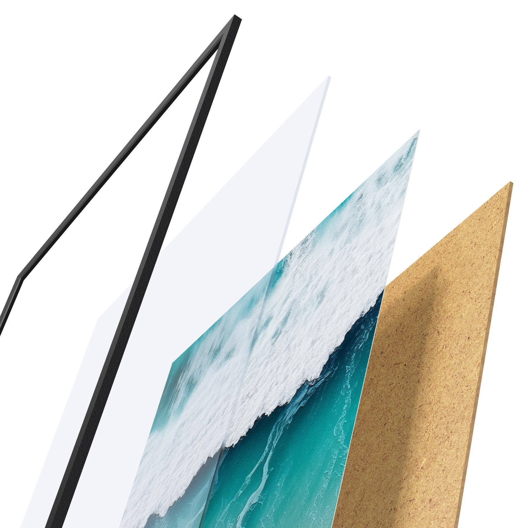 Das Poster besteht aus einem Rahmen, Plexiglas, einem gedruckten Bild und einer Rückwand aus Spanplatten. Dank der Halterungen auf der Rückseite kann das Poster sofort an die Wand gehängt werden.