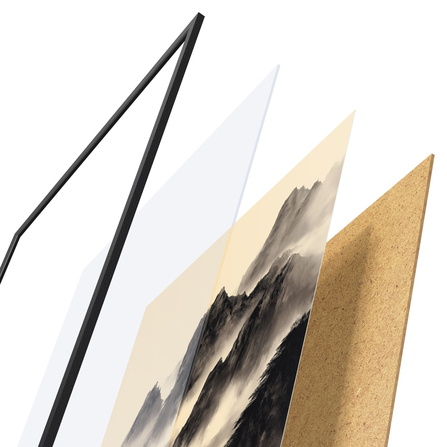 Das Poster besteht aus einem Rahmen, Plexiglas, einem gedruckten Bild und einer Rückwand aus Spanplatten. Dank der Halterungen auf der Rückseite kann das Poster sofort an die Wand gehängt werden.