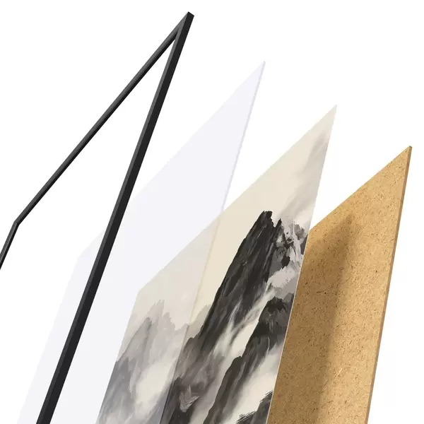 Das Poster besteht aus einem Rahmen, Plexiglas, einem gedruckten Bild und einer Rückwand aus Spanplatten. Dank der Halterungen auf der Rückseite kann das Poster sofort an die Wand gehängt werden.