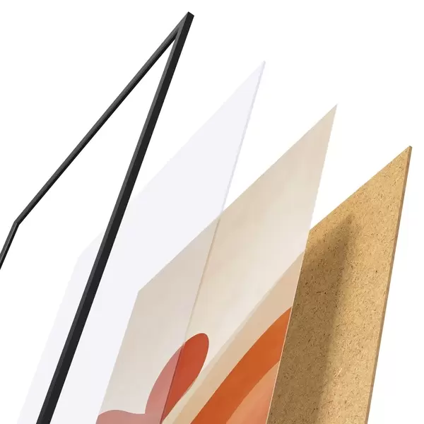 Das Poster besteht aus einem Rahmen, Plexiglas, einem gedruckten Bild und einer Rückwand aus Spanplatten. Dank der Halterungen auf der Rückseite kann das Poster sofort an die Wand gehängt werden.