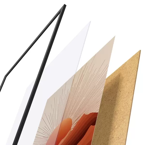 Das Poster besteht aus einem Rahmen, Plexiglas, einem gedruckten Bild und einer Rückwand aus Spanplatten. Dank der Halterungen auf der Rückseite kann das Poster sofort an die Wand gehängt werden.