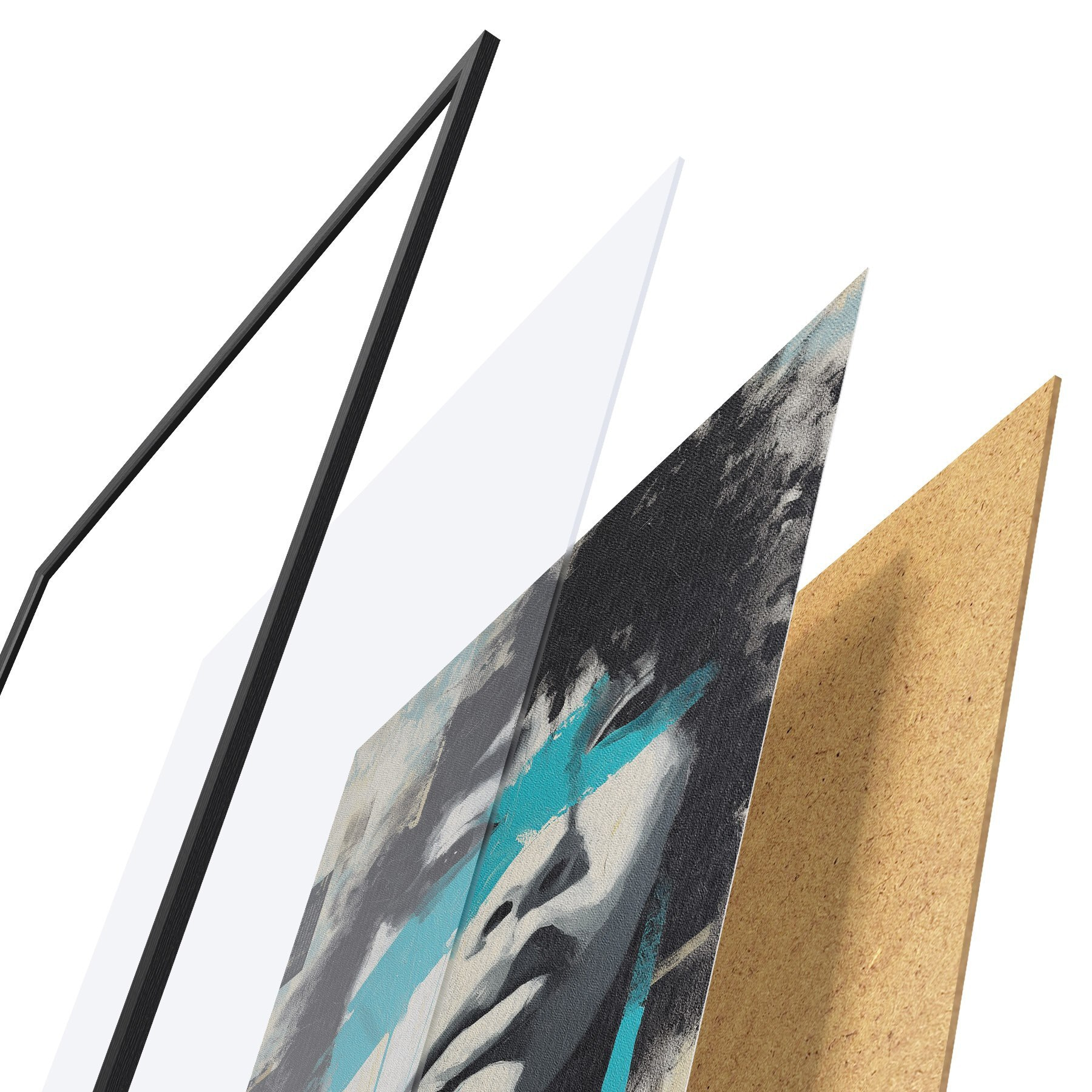 Das Poster besteht aus einem Rahmen, Plexiglas, einem gedruckten Bild und einer Rückwand aus Spanplatten. Dank der Halterungen auf der Rückseite kann das Poster sofort an die Wand gehängt werden.