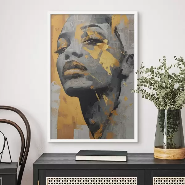 Poster Gemischtes Medienporträt mit Zeitungsfragmenten und dekorativen Pinselstrichen f45419