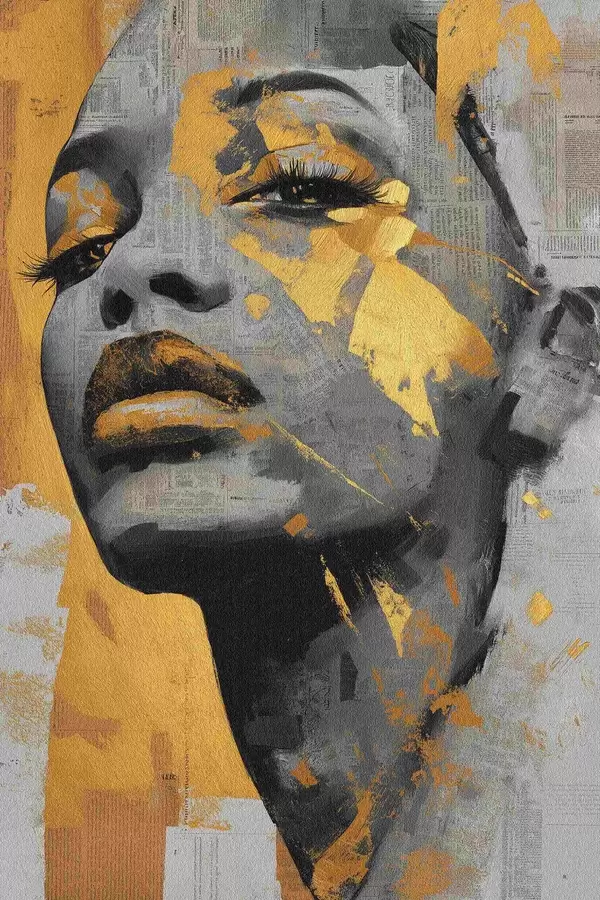 Poster Gemischtes Medienporträt mit Zeitungsfragmenten und dekorativen Pinselstrichen f45419
