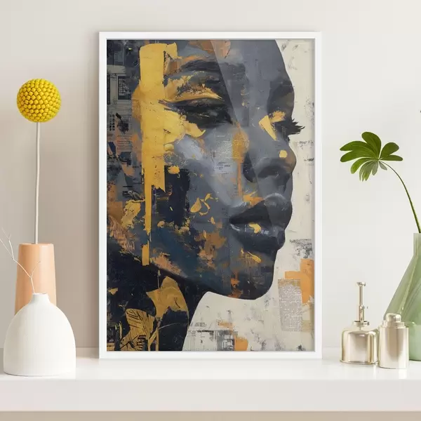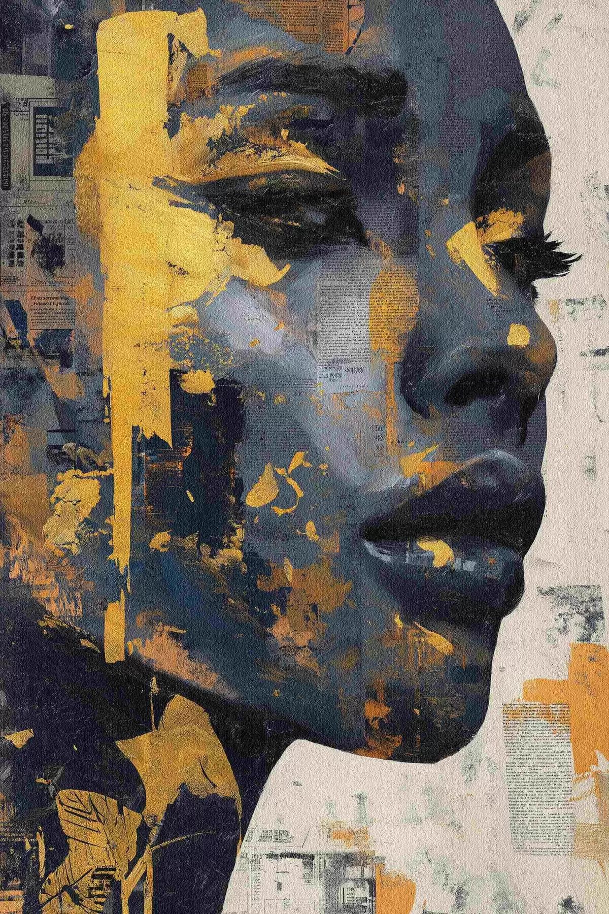 Poster Gemischtes Medienporträt mit Zeitungsfragmenten und dekorativen Pinselstrichen f45420