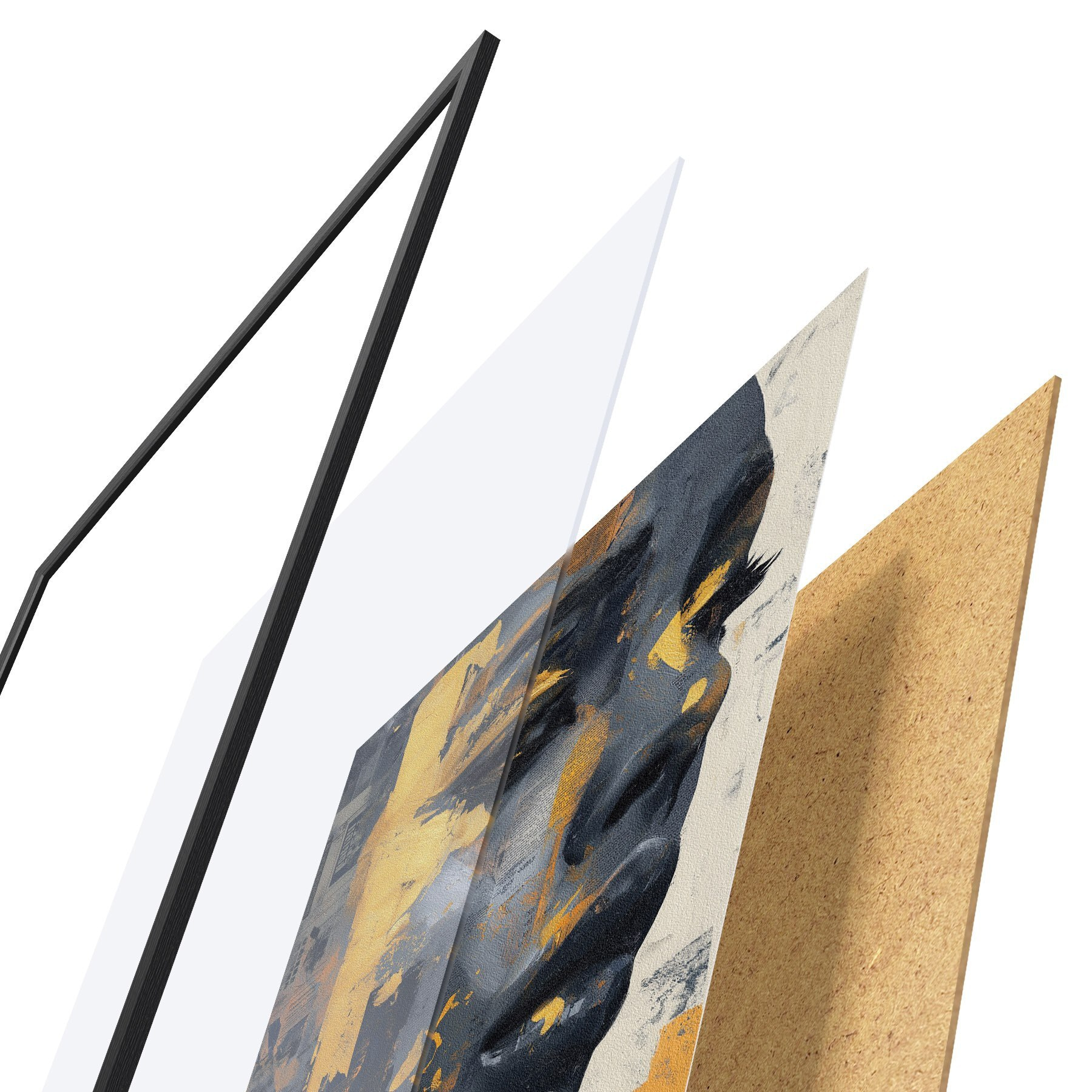 Das Poster besteht aus einem Rahmen, Plexiglas, einem gedruckten Bild und einer Rückwand aus Spanplatten. Dank der Halterungen auf der Rückseite kann das Poster sofort an die Wand gehängt werden.