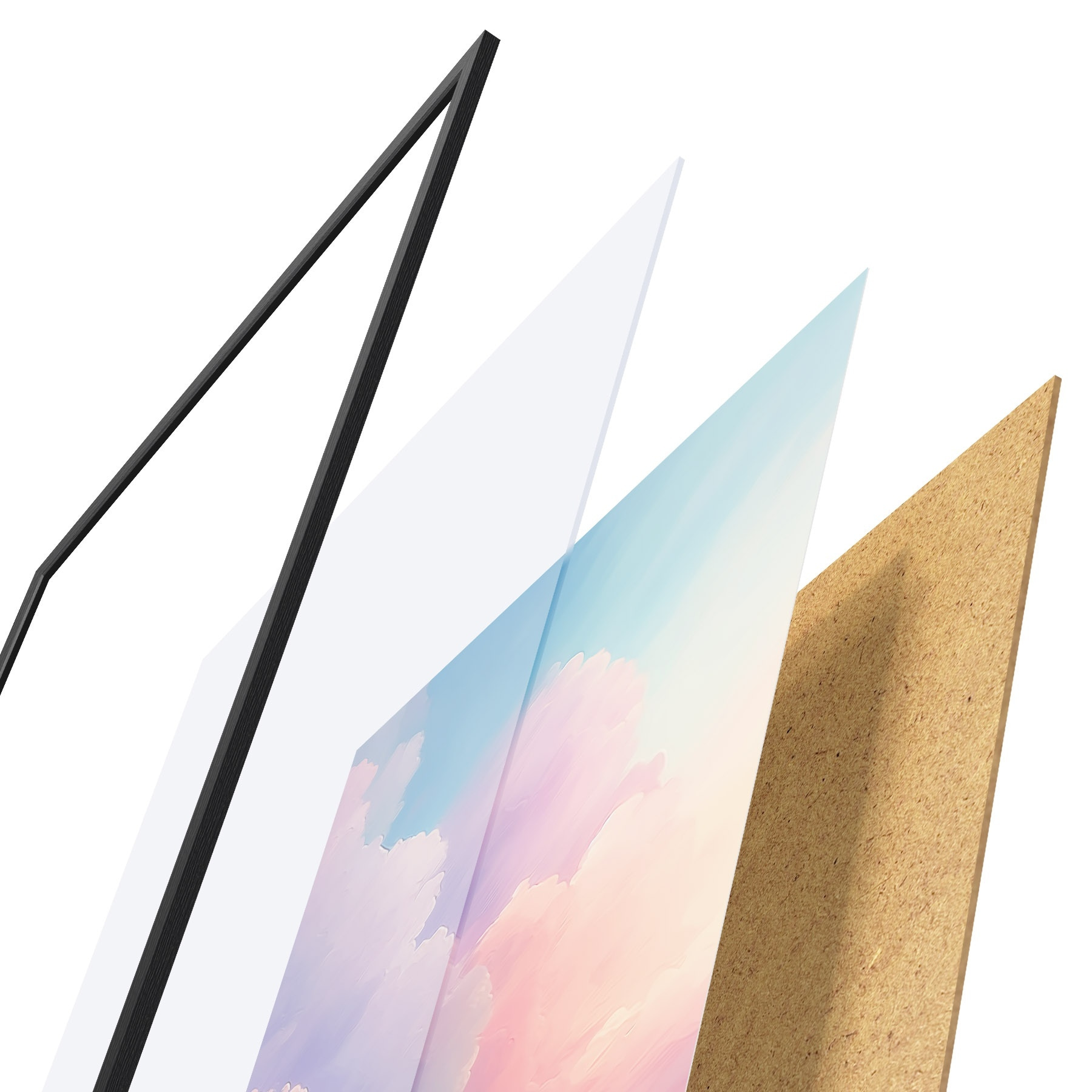 Das Poster besteht aus einem Rahmen, Plexiglas, einem gedruckten Bild und einer Rückwand aus Spanplatten. Dank der Halterungen auf der Rückseite kann das Poster sofort an die Wand gehängt werden.