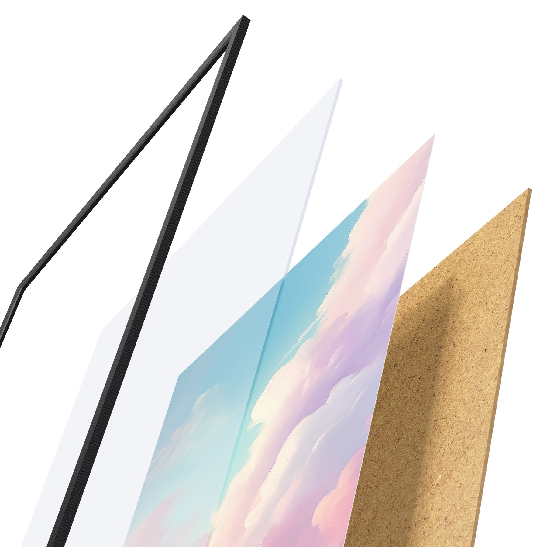Das Poster besteht aus einem Rahmen, Plexiglas, einem gedruckten Bild und einer Rückwand aus Spanplatten. Dank der Halterungen auf der Rückseite kann das Poster sofort an die Wand gehängt werden.