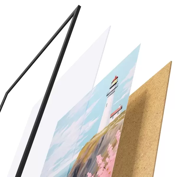 Das Poster besteht aus einem Rahmen, Plexiglas, einem gedruckten Bild und einer Rückwand aus Spanplatten. Dank der Halterungen auf der Rückseite kann das Poster sofort an die Wand gehängt werden.