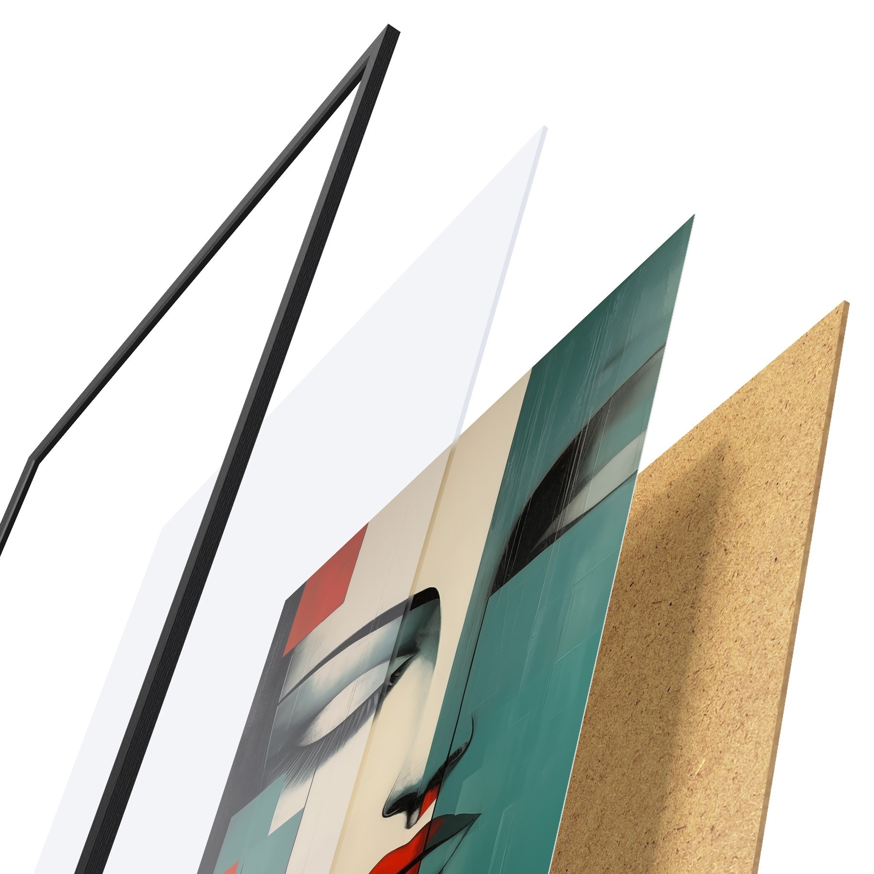 Das Poster besteht aus einem Rahmen, Plexiglas, einem gedruckten Bild und einer Rückwand aus Spanplatten. Dank der Halterungen auf der Rückseite kann das Poster sofort an die Wand gehängt werden.