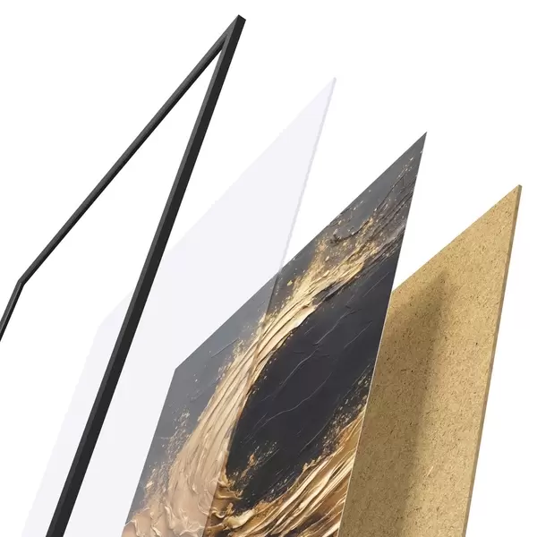 Das Poster besteht aus einem Rahmen, Plexiglas, einem gedruckten Bild und einer Rückwand aus Spanplatten. Dank der Halterungen auf der Rückseite kann das Poster sofort an die Wand gehängt werden.