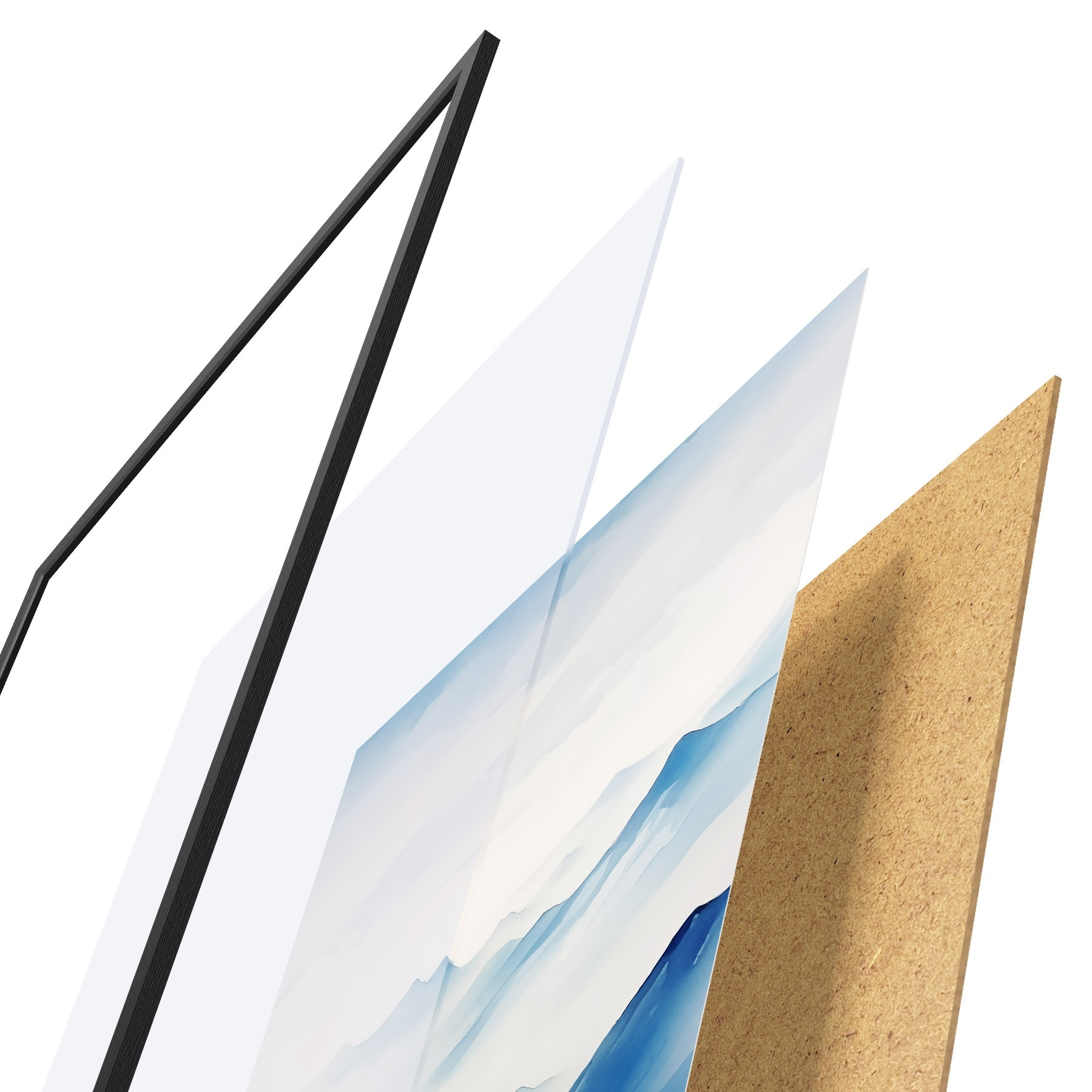 Das Poster besteht aus einem Rahmen, Plexiglas, einem gedruckten Bild und einer Rückwand aus Spanplatten. Dank der Halterungen auf der Rückseite kann das Poster sofort an die Wand gehängt werden.
