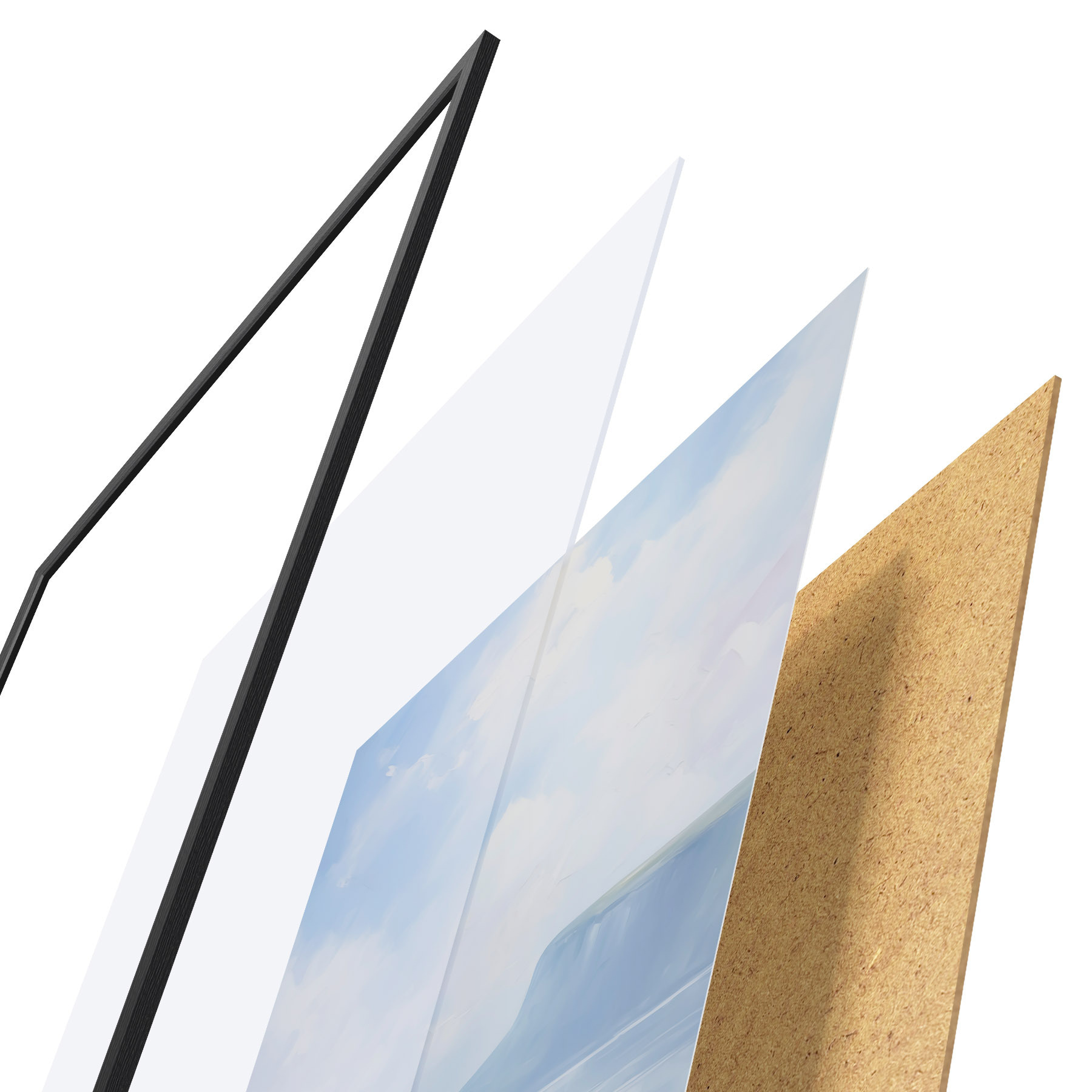 Das Poster besteht aus einem Rahmen, Plexiglas, einem gedruckten Bild und einer Rückwand aus Spanplatten. Dank der Halterungen auf der Rückseite kann das Poster sofort an die Wand gehängt werden.