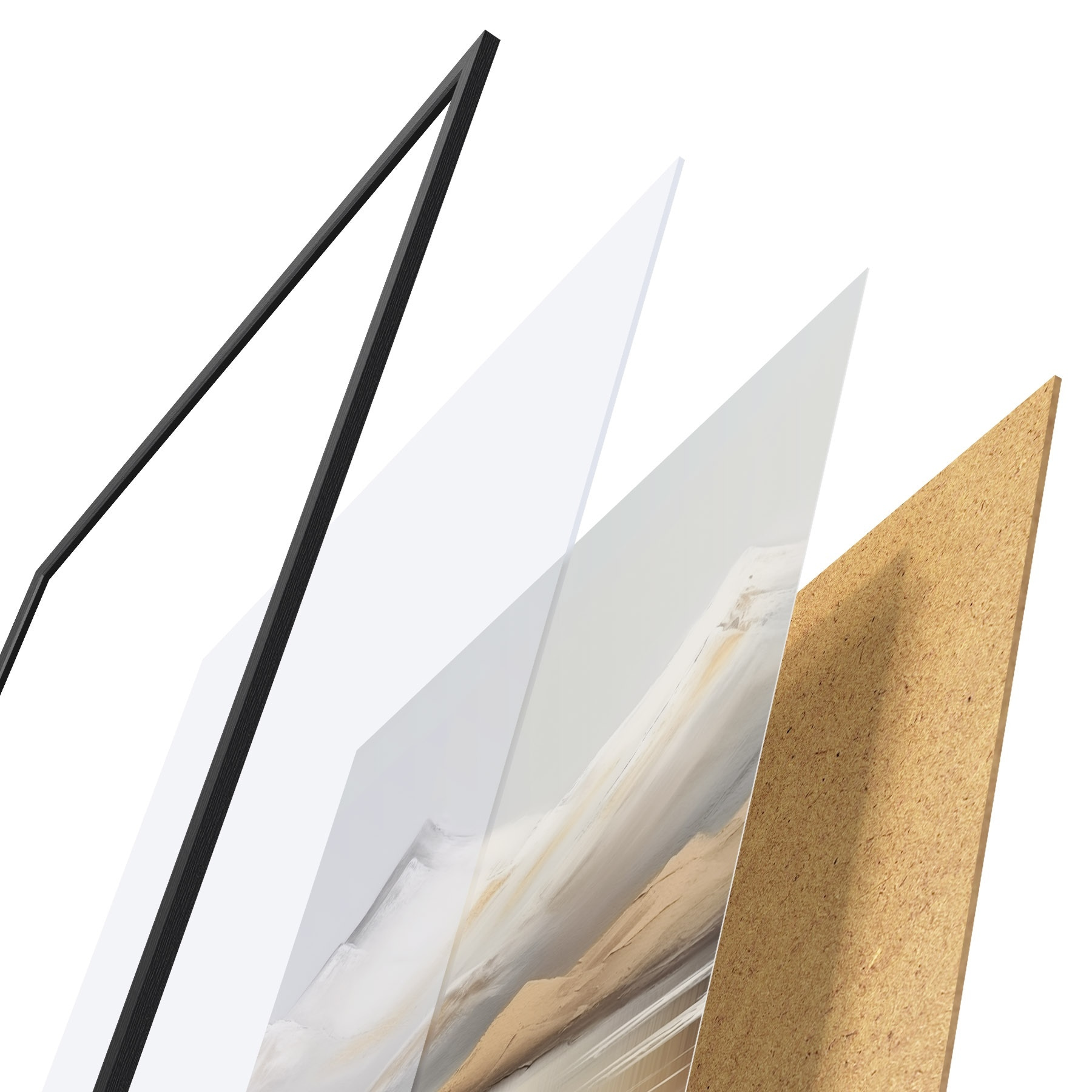 Das Poster besteht aus einem Rahmen, Plexiglas, einem gedruckten Bild und einer Rückwand aus Spanplatten. Dank der Halterungen auf der Rückseite kann das Poster sofort an die Wand gehängt werden.