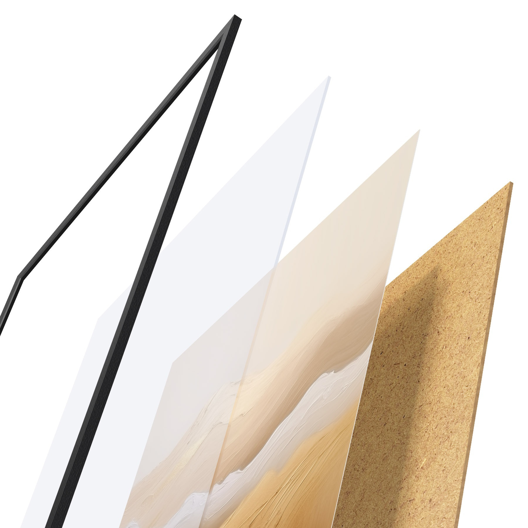 Das Poster besteht aus einem Rahmen, Plexiglas, einem gedruckten Bild und einer Rückwand aus Spanplatten. Dank der Halterungen auf der Rückseite kann das Poster sofort an die Wand gehängt werden.