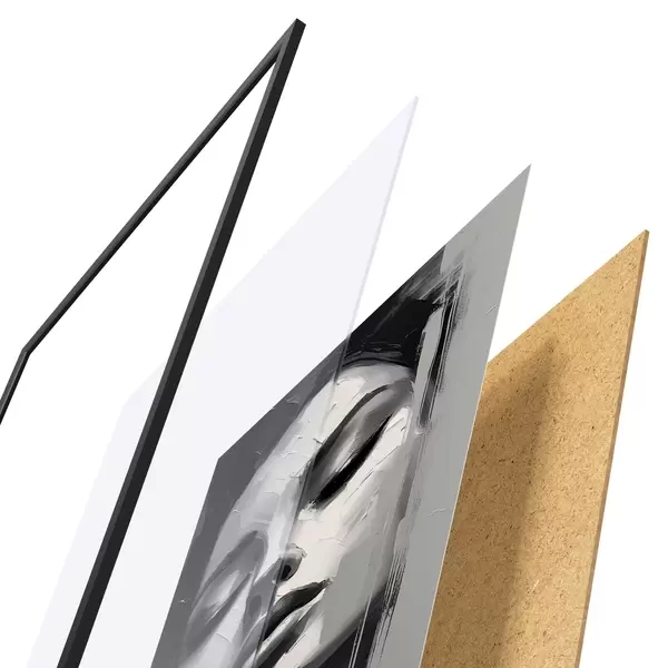 Das Poster besteht aus einem Rahmen, Plexiglas, einem gedruckten Bild und einer Rückwand aus Spanplatten. Dank der Halterungen auf der Rückseite kann das Poster sofort an die Wand gehängt werden.